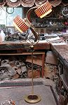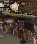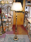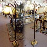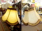 Lampe sur pied à cou antique avec abat-jour à 6 cotés de forme floral de style victorien, ornée de bandes de feuilles d'or et de franges. |